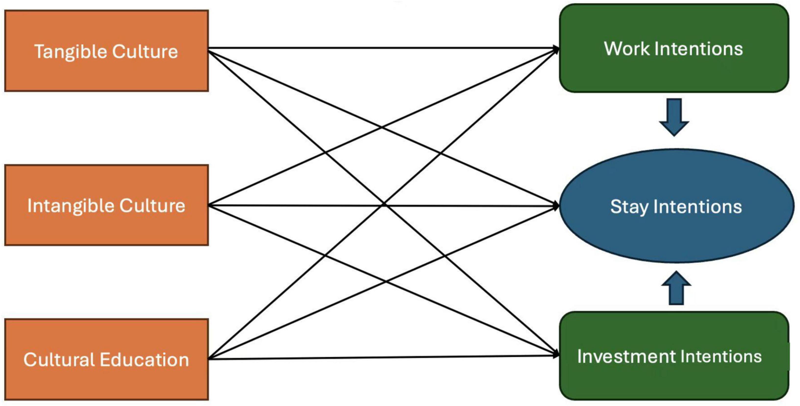 Building on these frameworks, three cultural dimensions are theorized as independent variables: Tangible Culture (T), Intangible Culture (U), and Cultural Education (E). These dimensions are expected to influence two mediating variables—Work Intentions (W) and Investment Intentions (B)—which in turn affect the ultimate outcome variable, Stay Intentions (S).