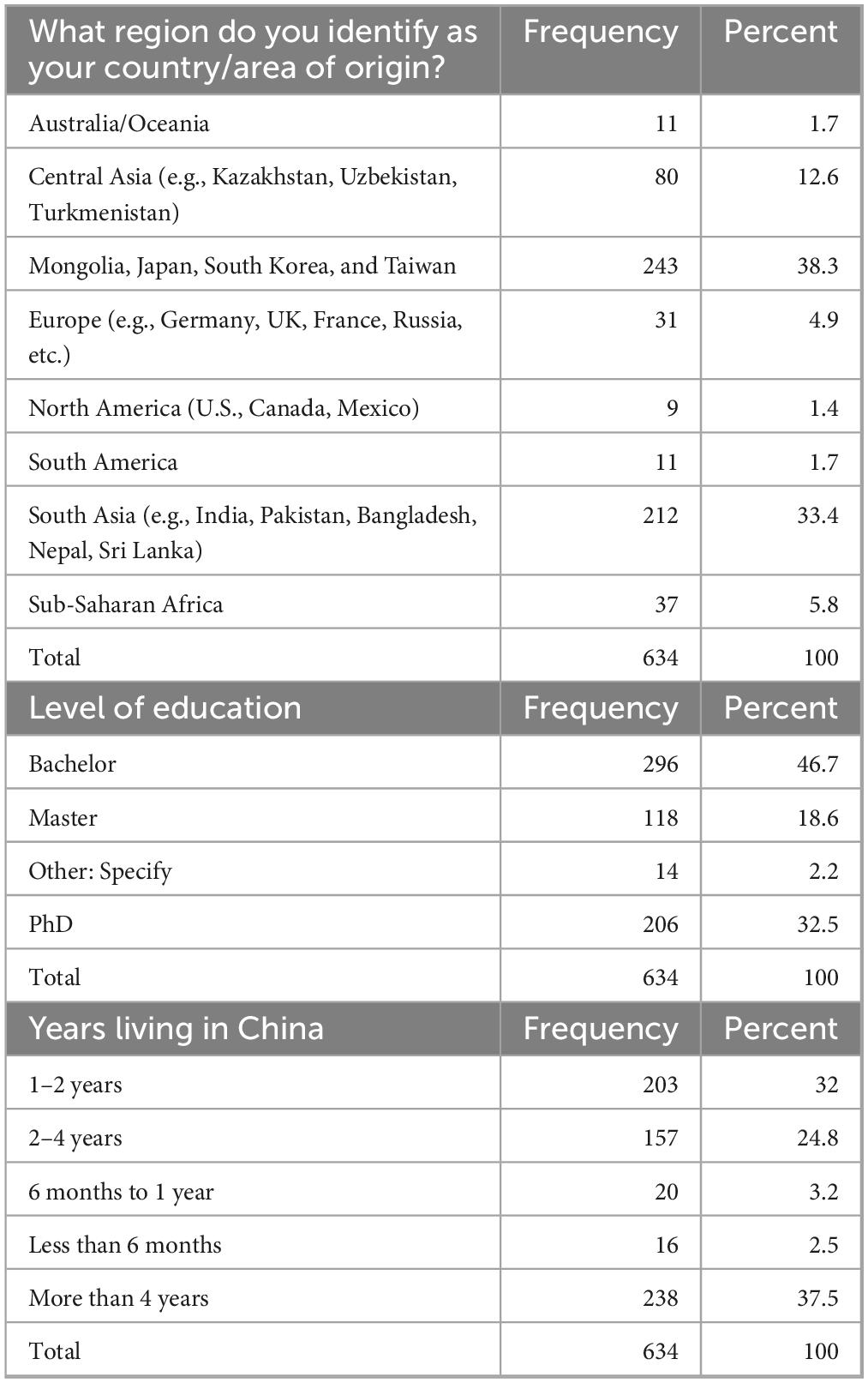 This study employed a quantitative, cross-sectional survey design to investigate how international students’ cultural experiences in China influence their post-study intentions. The descriptive statistics of the survey respondents are summarized in Table 1. A cross-sectional design was chosen because it efficiently examines relationships between variables at a single point in time, making it suitable for studying current attitudes and behavioral intentions (Dustmann and Okatenko, 2014). SEM model was selected as the primary analytical method because it simultaneously estimates multiple dependent relationships, incorporates both observed and latent variables, and accounts for measurement error (Dustmann and Okatenko, 2014). These capabilities make SEM well-suited for testing the proposed theoretical model, which includes multiple interrelated cultural dimensions and behavioral outcomes.