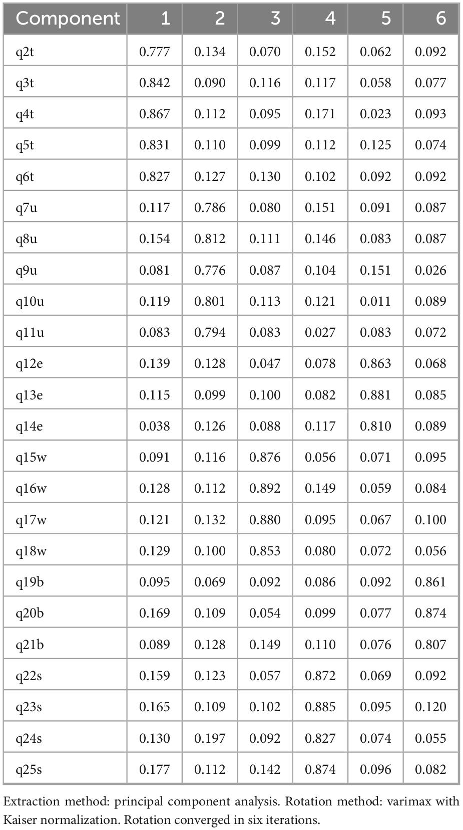 The results of the EFA showed excellent psychometric properties (KMO = 0.877; Bartlett’s test p < 0.001) (Table 2). A six-factor solution explained 76.24% of the total variance (Table 3). The initial unrotated component matrix showed several items with moderate cross-loadings, such as q15w, which loaded 0.525 on