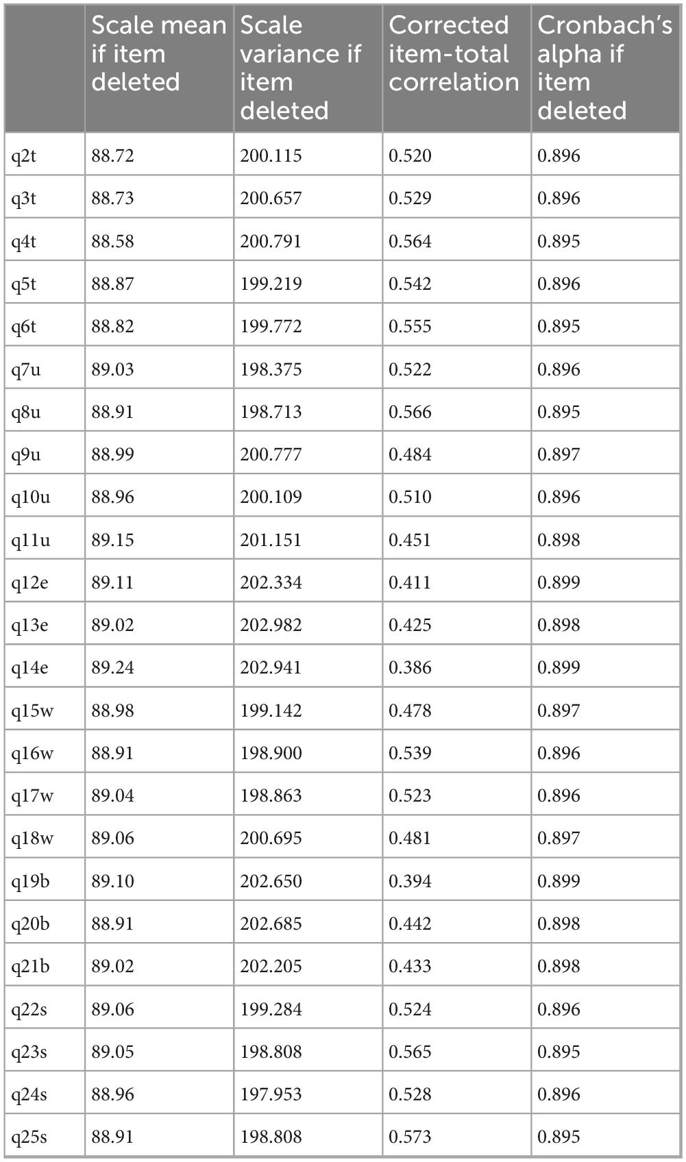 Reliability was evaluated using Cronbach’s alpha and corrected item–total correlations for each construct. A threshold of α ≥ 0.70 was used for acceptable reliability, with higher values indicating stronger internal consistency. Item–total correlations > 0.30 were considered acceptable. Corrected item–total statistics were also examined to assess whether deleting any item would improve reliability (Anderson and Gerbing, 1988).
