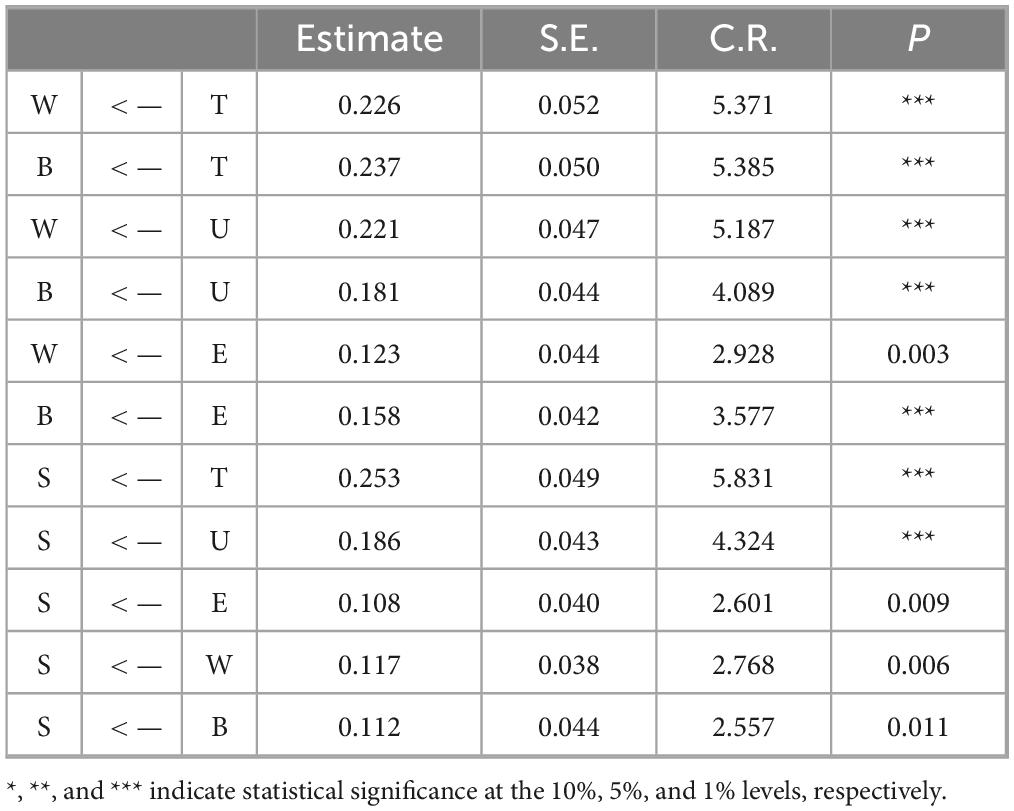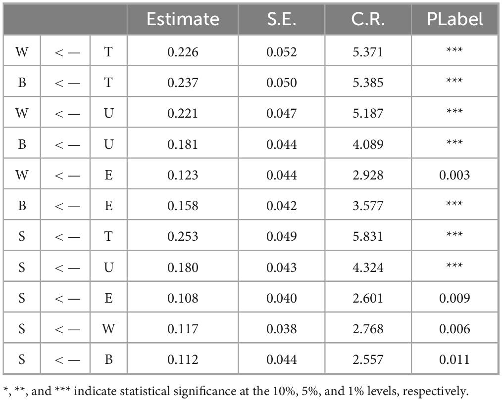 CFA was performed to test the measurement model’s validity before examining structural relationships. Convergent validity was evaluated using standardized factor loadings (>0.70), composite reliability (CR ≥ 0.70), and average variance extracted (AVE ≥ 0.50) (Baraldi and Enders, 2010; Park et al., 2002). Discriminant validity was assessed using the Fornell–Larcker criterion, ensuring that each construct shared more variance with its own indicators than with other constructs (Nunnally, 1978). Model fit was evaluated with indices including RMSEA (<0.05 indicating close fit) (Brown, 2015; Fornell and Larcker, 1981), CFI, TLI, and χ2/df ratios, following recommended thresholds.
