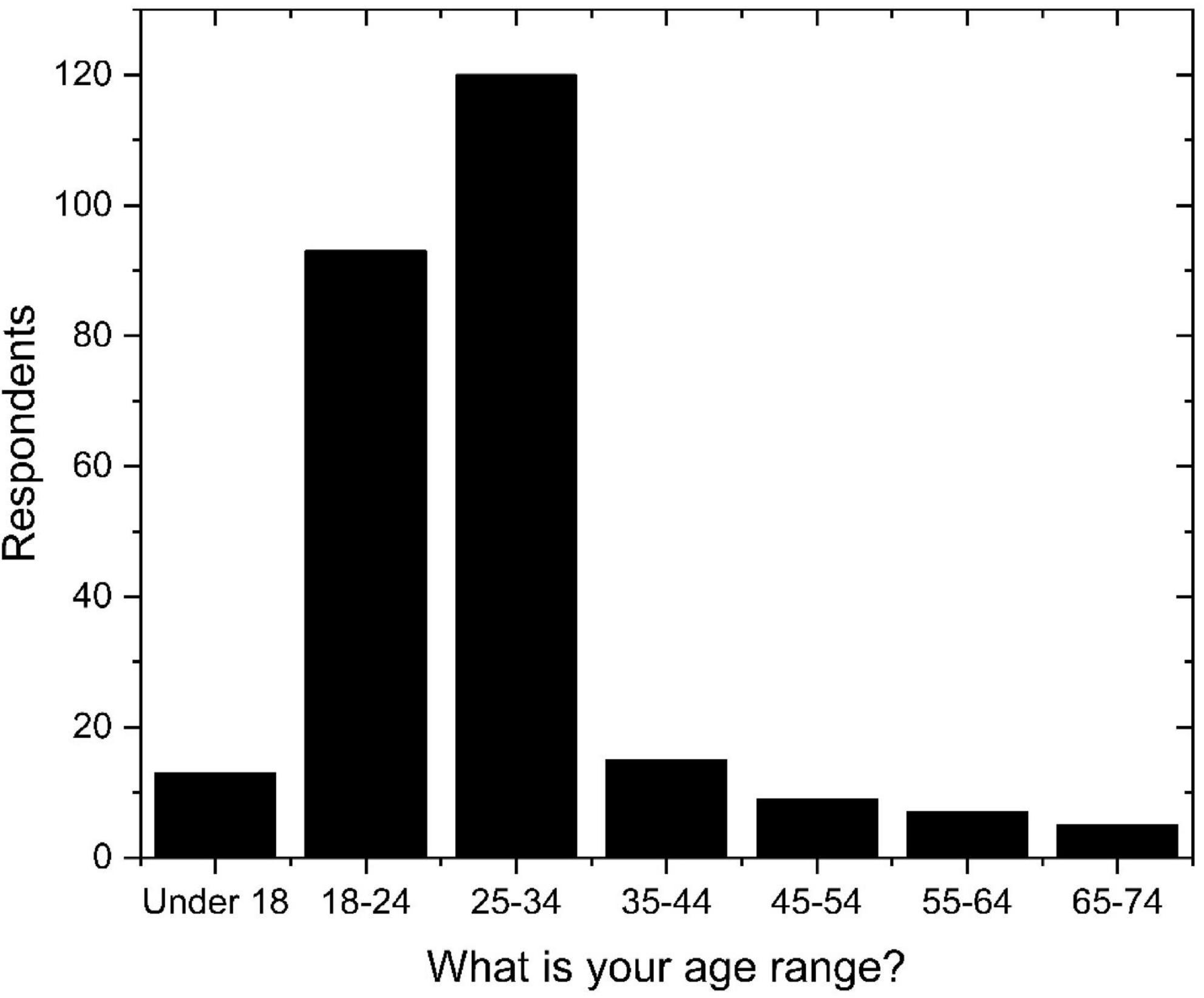 Survey responses were limited to seven age categories: under 18, 18–24, 25–34, 35–44, 45–54, 55–64, and 65–74 years of age. Of these age ranges, 120 attendees came from the 25–34 years age group, which accounts for 46% of the respondents. The next largest was the 18–24 age group, with 93 attendees (35%). Figure 2 provides a visual representation of the age distribution of the panel attendees.