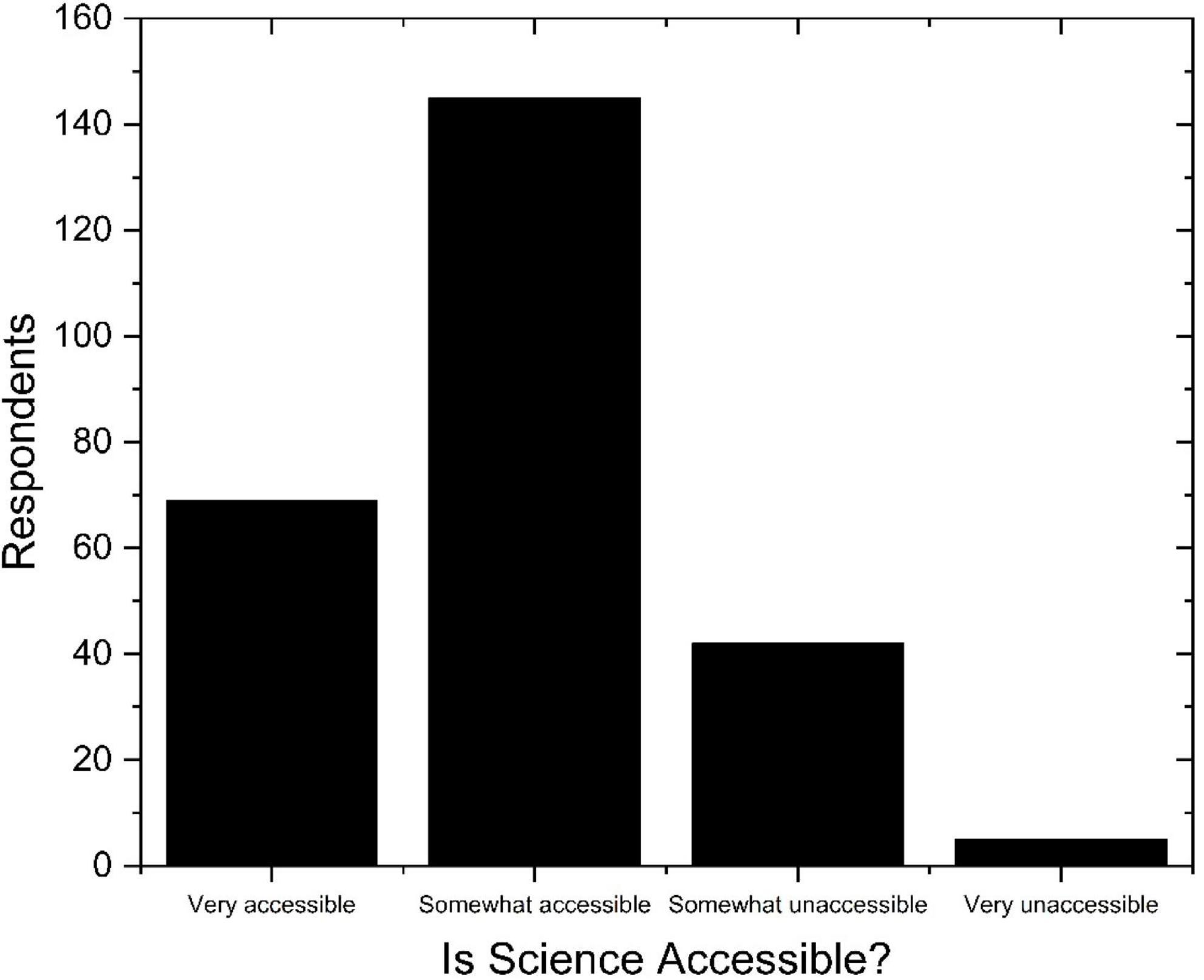 Survey responses were limited to “Very accessible,” “Somewhat accessible,” “Somewhat inaccessible,” and “Very inaccessible.” Of the 261 responses to this question, 26% responded with “Very accessible,” while 56% responded with “Somewhat accessible.” 16% responded with “Somewhat unaccessible,” and 2% with “Very unaccessible.” Figure 4 provides a graphical representation of the differing attitudes toward science accessibility before the panel presentation.