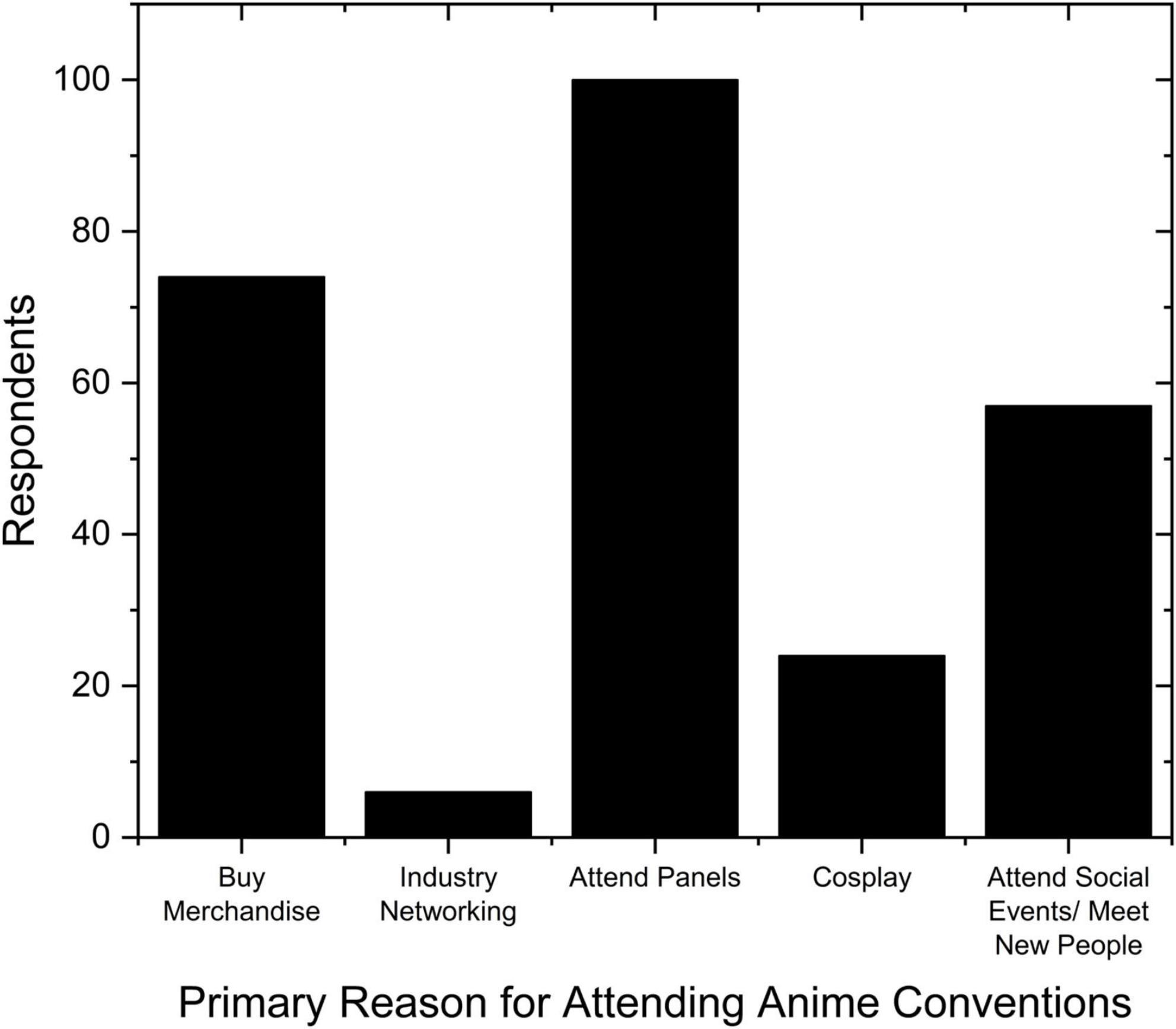 Of the 261 responses, 100 (38%) selected “attend anime conventions to attend panels.” 28% and 22% responded with “buy merchandise” and “attend social events.” Of the remaining choices, 9% selected “cosplay,” while 2% selected “industry networking.”