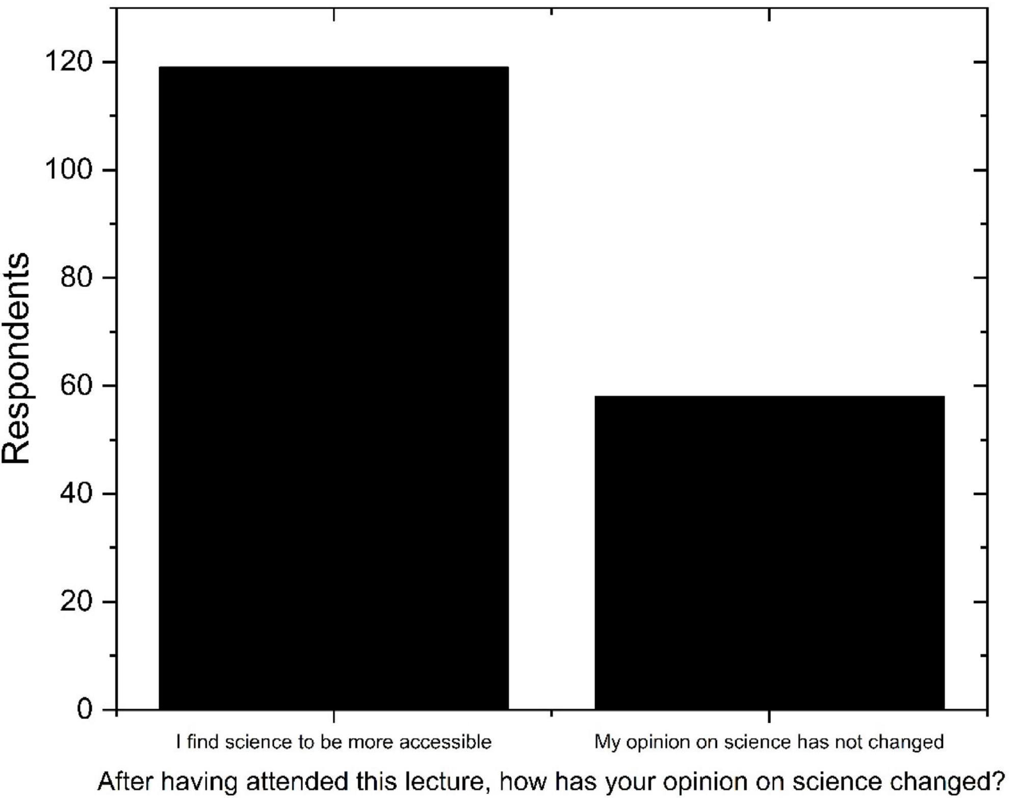 Of particular importance to this point are the results from pre-panel survey question #6 and the post-panel survey question. To recap, 145 panel attendees indicated that science was “somewhat accessible” before the panel presentation. However, 67% of the 177 respondents to the post-panel survey reported that they found science more accessible after the panel. This result presents an encouraging turnaround in the attitude toward science, at least after the panel, which is crucial to fruitful science discourse.
