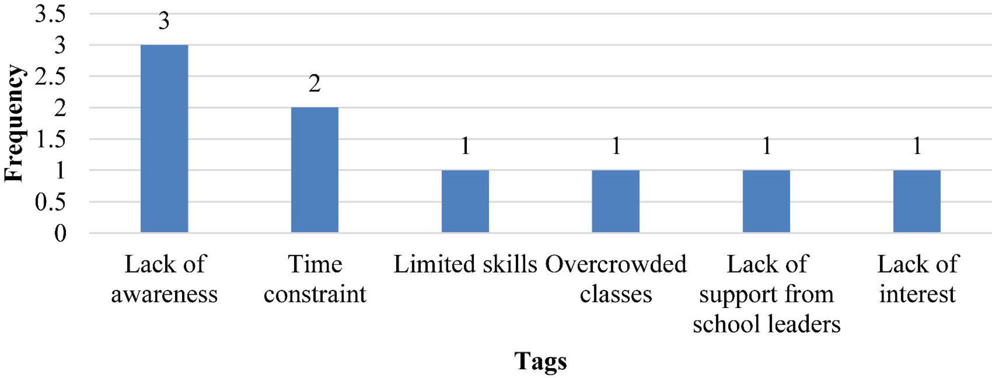 The Taguette analysis results showed the frequency of tags regarding the barriers hindering teachers from implementing PjBL (see Figure 1). The Figure below shows the frequency of tags.