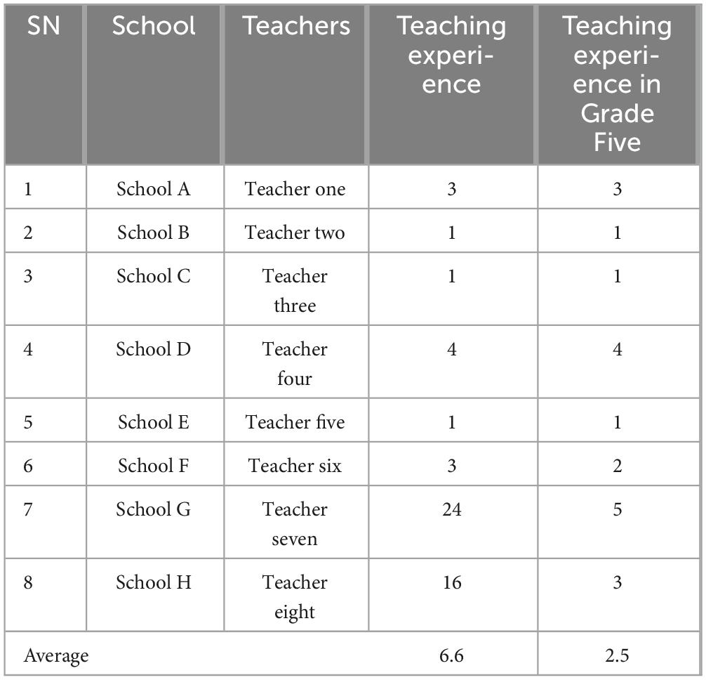 The sampled teachers have a teaching experience of 6.6 years. Among the participants, five out of eight have more than 3 years of teaching experience. In general, teachers have 2.5 years of teaching experience in Grade Five. Half of the participants have three or more years of teaching experience in mathematics in Primary Five. Although Table 2 shows that three teachers are novices in the profession with 1 year of teaching experience, the average teaching experience suggests that teachers may have some prior understanding of project-based learning.