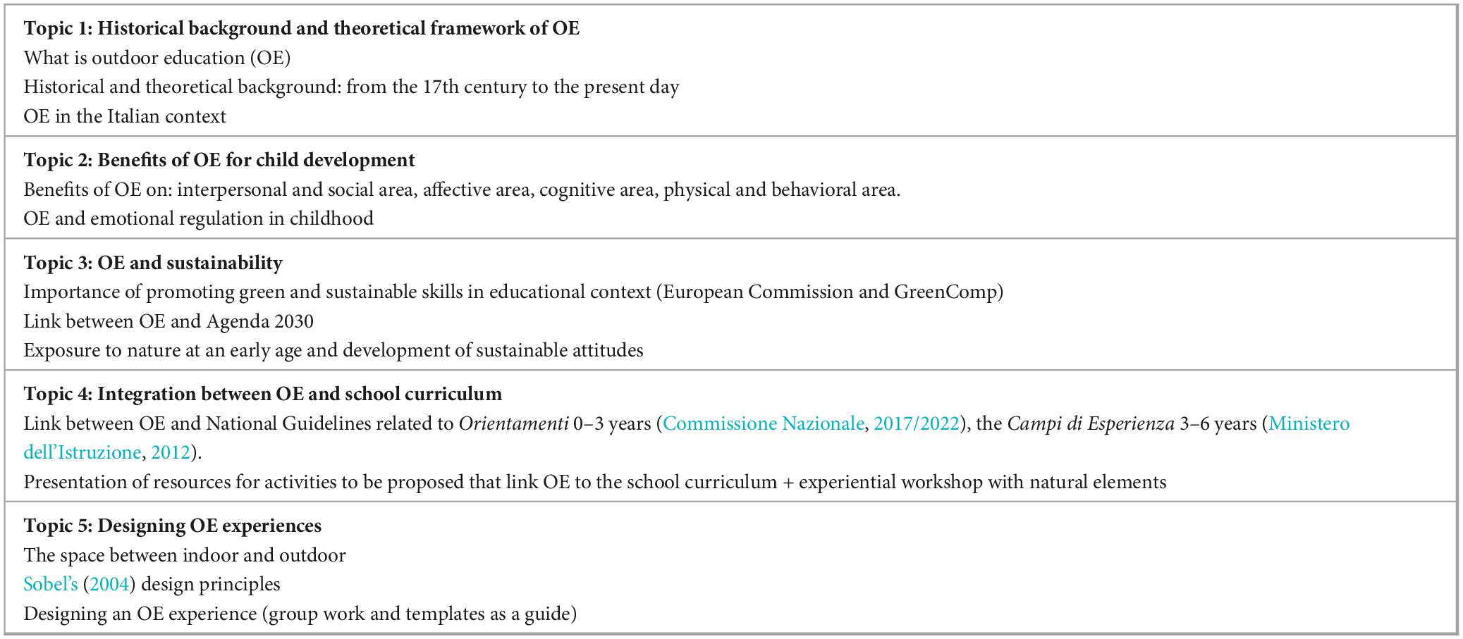 After analyzing the literature, key contributions were identified for designing a training course on OE for student teachers and educators in the 0–6 educational sector. Publications providing theoretical and historical frameworks were selected (e.g., Antonietti et al., 2022; Dahlgren and Szczepanski, 1998; Fang et al., 2022; Weyland and Galletti, 2018). Next, studies highlighting OE’s benefits for child development (e.g., Dillon et al., 2004; Pirchio et al., 2021; Yıldırım and Akamca, 2017; Weeland et al., 2019) and its role in fostering sustainable attitudes (e.g., Valentini et al., 2017; Wells and Kristi, 2006) were also included. Several studies on teachers’ and student teachers’ attitudes toward adopting OE were examined (e.g., Barrable and Lakin, 2020; Barrable et al., 2022; Borsos et al., 2022; Sjöblom et al., 2023; Tuuling et al., 2019). We examined interventions where the effects of OE training were explored (e.g., Cevher Kalburan, 2022; Gray and Colucci-Gray, 2019; Sekula et al., 2024; Wineberg, 2023; Zacharious and Valanides, 2006). The review by Wolf et al. (2022), synthesizing 46 empirical studies worldwide and focusing on competencies, content areas, and pedagogical strategies for OE preparation, was particularly relevant. Finally, publications containing valuable guidelines for OE pathway design and teacher preparation were also considered (e.g., Higgins and Nicol, 2002; INDIRE et al., 2024). These topics are detailed in Table 1.