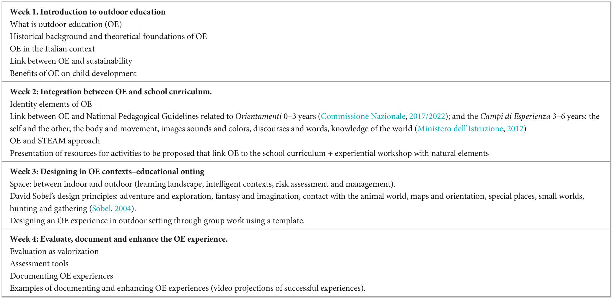 In recent years, growing attention to global sustainability challenges has highlighted the need for integrated educational approaches that promote awareness and action for Sustainable Development (European Commission, 2022). This perspective is fully in line with the principles outlined in the 2030 Agenda for Sustainable Development, adopted by all United Nations member states, which provides a shared roadmap to guide global action toward a more equitable and sustainable future (United Nations, 2015). The Agenda identifies 17 Sustainable Development Goals (SDGs) that address key global issues and, in this context, OE represents an effective educational approach to contribute to the achievement of several goals of the 2030 Agenda (Hu and Mou, 2025). For example, OE promotes quality education [Sustainable Development Goal (SDG) 4], stimulates climate awareness and action (SDG 13), and strengthens the links to life on Earth (SDG 15). Moreover, in the aftermath of the COVID-19 pandemic, several authors have stressed the importance of returning to the outdoors, emphasizing the beneficial psycho-physical effects of contact with nature (Slater et al., 2020). It is because of studies like this (Slater et al., 2020) and the growing awareness of the benefits of being outdoors that the importance of OE practices has found new momentum and recognition in the wake of the COVID-19 pandemic (Chistolini, 2022). Despite this, however, especially in those countries where OE is not considered a mainstream educational element, it is often relegated to episodic, local, or private initiatives and is not considered an integral part of the educational and school curriculum (Giunti and Schenetti, 2024). In recognizing OE’s benefits in terms of a child’s psychological and physical wellbeing (Weeland et al., 2019) and in the development of sustainable attitudes (Valentini et al., 2017), a cultural change must be promoted that fosters the adoption of OE in educational settings with teachers, student teachers, and educators representing the key agents (Zdybel et al., 2024). Studies show that although many student teachers have positive attitudes toward OE, practical application is hindered by low competence and a lack of structured training (Sjöblom et al., 2023). In response to these critical issues, the current program is presented as an innovative course, developed and implemented in the Italian context, aimed at student teachers and educators. Its design was informed by the characteristics of the Italian educational framework, considering national curricular guidelines that emphasize experiential and holistic learning (Ministero dell’Istruzione, 2012). Moreover, since OE in Italy is not yet formally integrated into national curricula or teacher education programs participants may have limited previous experience in this field. For this reason, the course was designed as an introductory training aimed at building foundational knowledge, skills, and confidence in implementing outdoor practices.