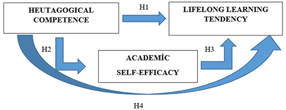 The extant literature has firmly established the positive influence of academic self-efficacy on learning motivation and academic performance (Chemers et al., 2001; Diseth, 2011). Nonetheless, the literature on whether self-efficacy can mediate the association explained by academic and heutagogical learning orientations, as well as lifetime learning attitudes, is scarce. This gap is severe for planning to develop people's lifelong learning skills, especially at the higher education level. Recognition of the mediating role of academic self-efficacy will aid in the design of effective heutagogical strategies aimed at promoting lifelong learning proclivities, ultimately informing better educational policies and teaching strategies. The advancement of policies and teaching guidelines suitable for the university student learning process, as well as academic SE studies, will contribute to the promotion of lifelong learning, as indicated by the results of this study. Thus, this study seeks to fill a notable void in the literature. The research hypotheses are described in Figure 1 below:
