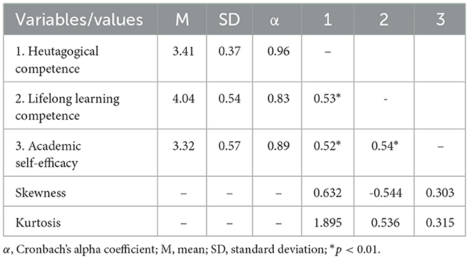 In SEM, we used a two-step procedure. An overall model that included all study variables was created and tested first. Secondly, a structural model was constructed to examine the role of latent variables and to study the mediational pathways. This model provided direct effects between heutagogy, academic self-efficacy, and lifelong learning tendency, and indirect effects of academic self-efficacy on lifelong learning tendency.