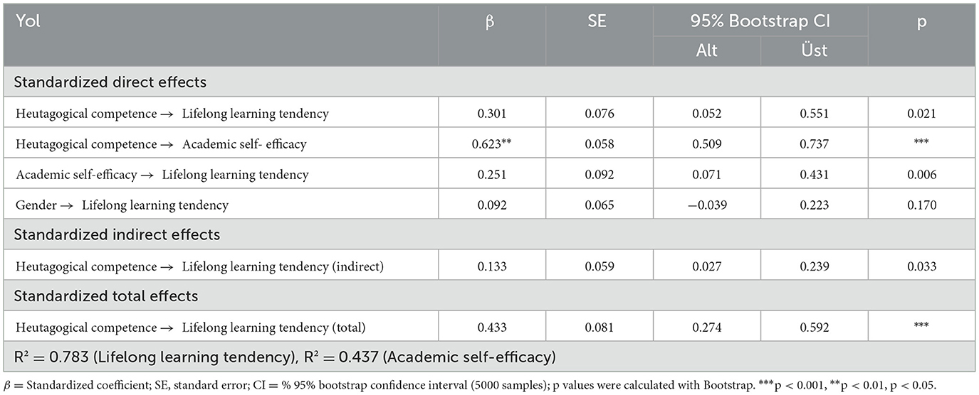 Discussion: These results indicate that supporting students' academic self-efficacy is crucial for strengthening heutagogy–based learning processes in educational environments. The study contributes to the literature by uncovering a new mechanism within the heutagogical competence-academic self-efficacy–lifelong learning pathway and clarifying that this mediation is partial rather than complete.