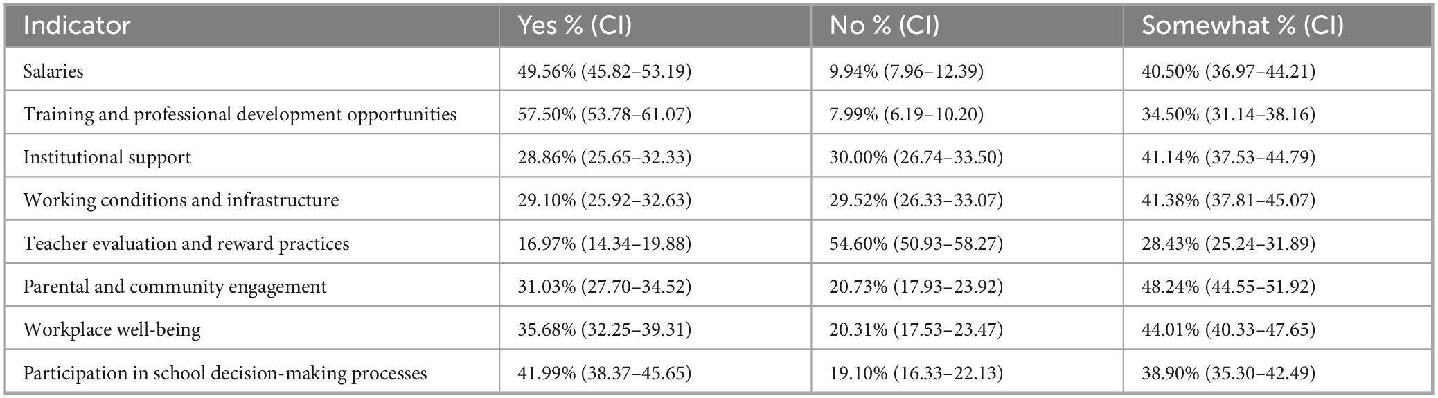 Teachers were asked whether they had noticed improvements in their work and professional environment over the past 2 years. The indicators examined included salaries, opportunities for professional development, institutional support, working conditions and infrastructure, evaluation and reward practices, parental and community engagement, workplace well-being, and participation in school decision-making. As shown in Table 1, the highest proportion of positive responses (“yes”) was reported for opportunities related to professional development (57.5%), followed by salaries (49.6%) and participation in school decision-making (42.0%). By contrast, the lowest reported improvement concerned evaluation and reward practices (17.0%), where more than half of respondents (54.6%) selected “no.” For indicators such as institutional support, working conditions, and workplace well-being, the modal response was “somewhat,” suggesting perceptions of partial but uneven progress across schools. The 95% confidence intervals (CI) for all indicators are presented in Table 1 to provide greater statistical precision and to reflect the variability of valid responses across participants.