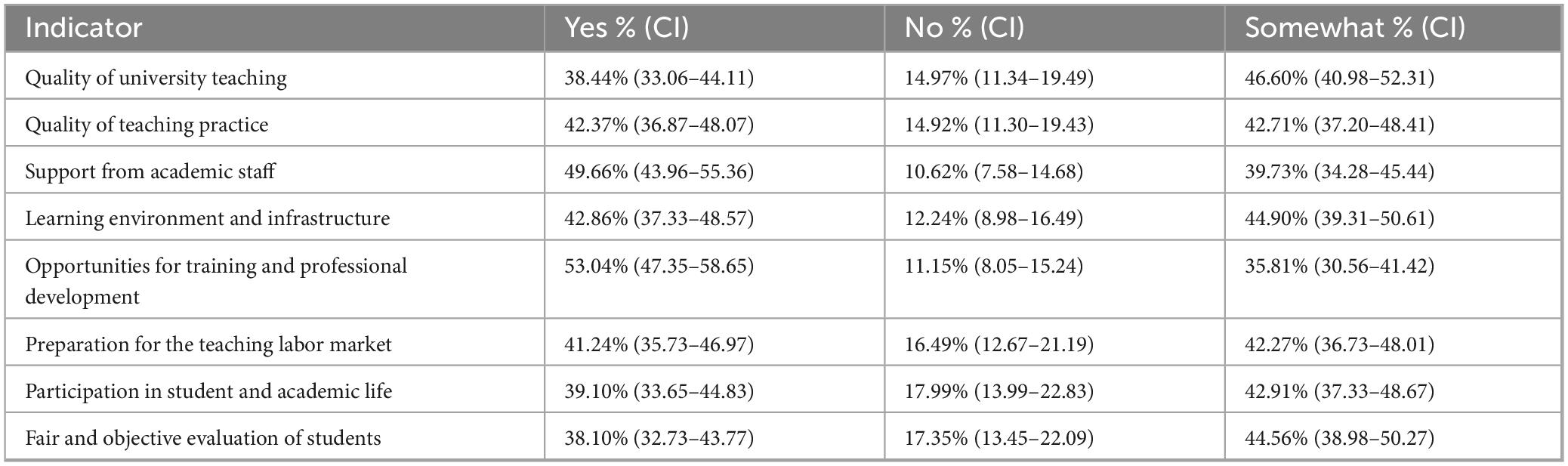 As shown in Table 2, the highest proportion of positive responses (“yes”) was reported for opportunities related to professional development (53.0%)], support from academic staff (49.7%)], and the quality of teaching practice (42.4%). By contrast, the lowest positive perceptions concerned fair and objective evaluation (38.1%)] and the quality of university teaching (38.4%). For several indicators, the modal response was “somewhat,” indicating that many students perceived partial progress. The 95% confidence intervals (CI) for all indicators are presented in Table 2 to reflect the variability of valid responses across participants.