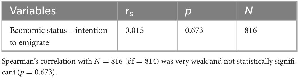 To assess the relationship between perceived economic status and the intention to leave Albania, a Spearman’s rank-order correlation was performed. The results revealed a very weak and non-significant association, r3(814) = 0.015, p = 0.673. The corresponding data are presented in Table 3.