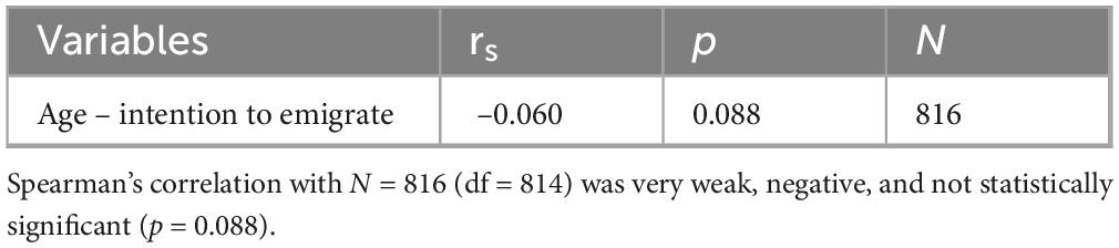 To examine the association between age and the intention to emigrate from Albania, Spearman’s rank-order correlation was conducted. The results indicated a very weak, negative, and non-significant correlation, r3(814) = –0.060, p = 0.088. The corresponding results are presented in Table 4.