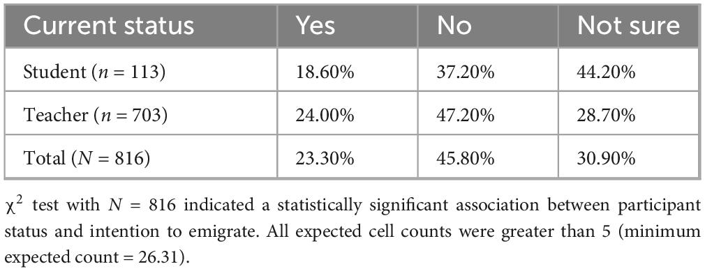 A chi-square test of independence was conducted to examine the association between participants’ status (teachers vs. student teachers) and their intention to leave Albania (“yes,” “no,” “not sure”). The results revealed a statistically significant relationship, χ2(2, N = 816) = 10.98, p = 0.004. Student teachers were more likely to report being unsure (44.2%) and less likely to state “yes” (18.6%) compared to teachers, who showed a higher proportion of definite responses (“yes” = 24.0%, “no” = 47.2%). The corresponding results are presented in Table 5.