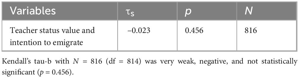 Kendall’s tau-b test was conducted to examine the association between participants’ perceptions of the value placed on the teaching profession and their intention to emigrate from Albania. The results indicated a very weak, negative, and non-significant correlation, τs(814) = –0.023, p = 0.456. The corresponding results are presented in Table 6.
