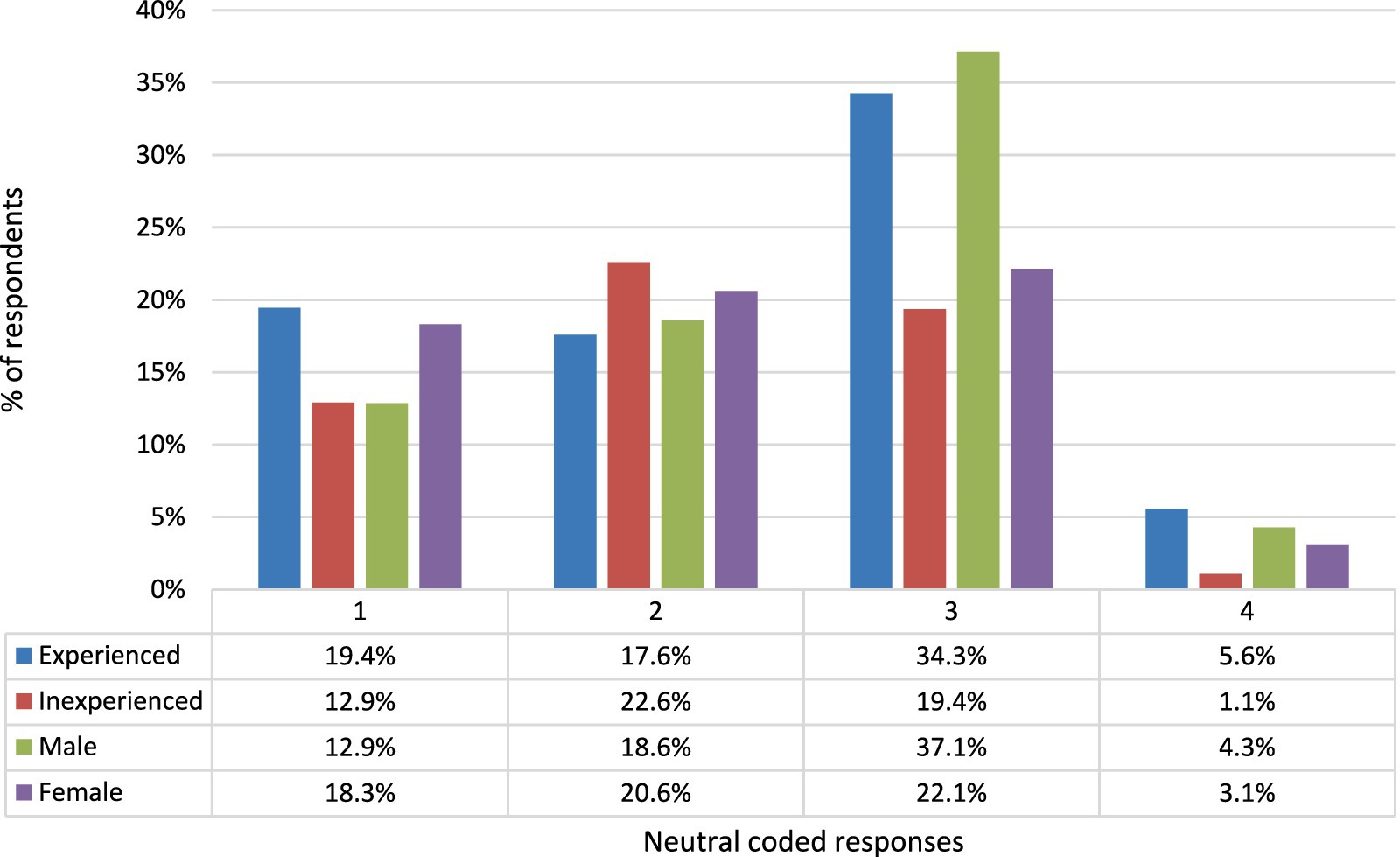 Figure 2. Breakdown of neutral-coded responses by teaching experience and sex of participants. Code meanings (see Table 6): 1 = other factors more important, 2 = did not notice a difference, 3 = philosophical objection, 4 = differences but not advantages.