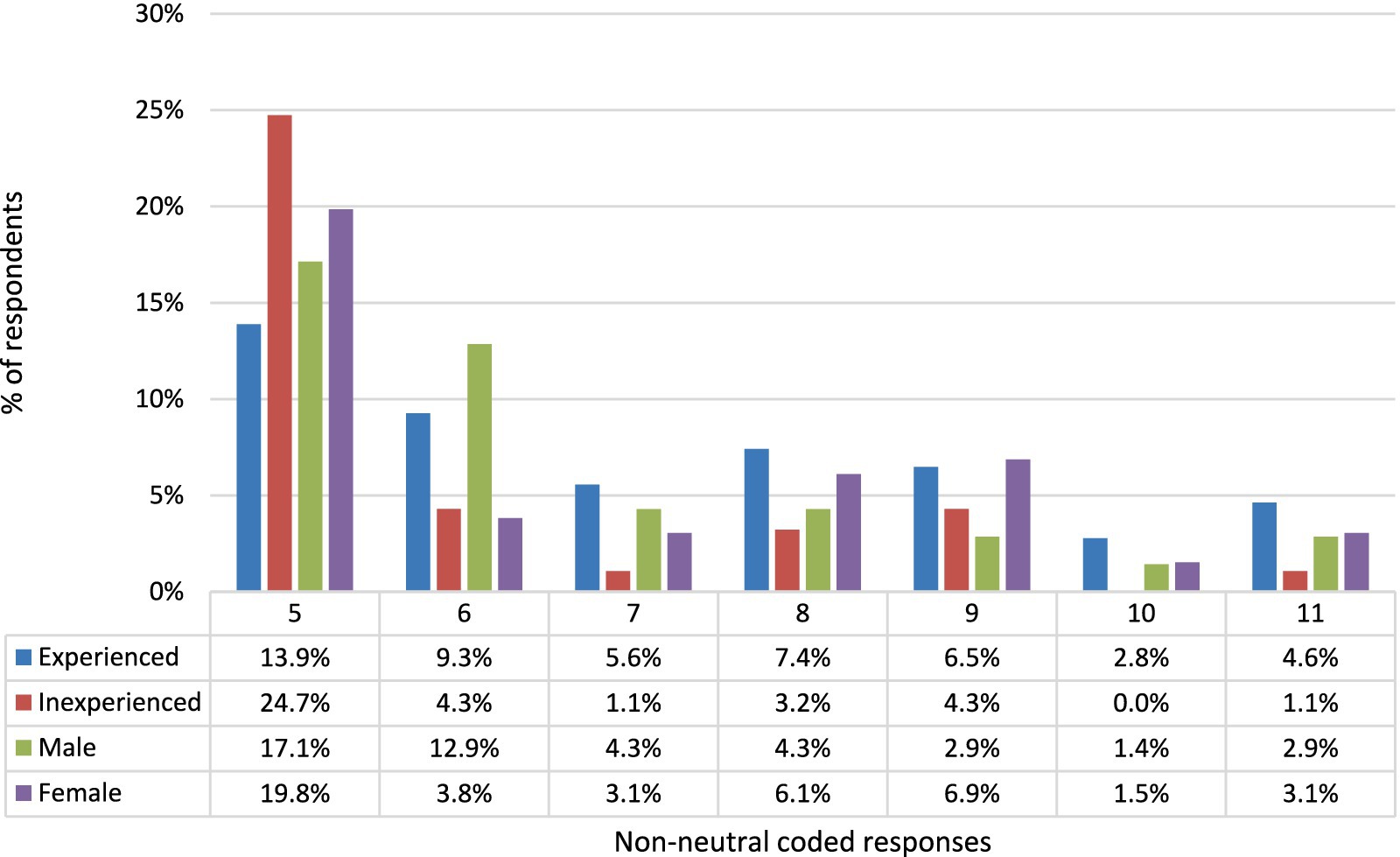 Figure 3. Breakdown of non-neutral coded responses by teaching experience and sex of participants. Code meanings (see Table 6): 5 = female voices are easier to hear, 6 = Female speech content (vocabulary/grammar/segmentals) is better, 7 = female speech suprasegmentals (intonation/speed/emotion) is better, 8 = personal familiarity with female speakers, 9 = male voices easier to hear, 10 = male speech content (vocabulary/grammar/segmentals) is better, and 11 = male speech suprasegmentals (intonation/speed/emotion) better.
