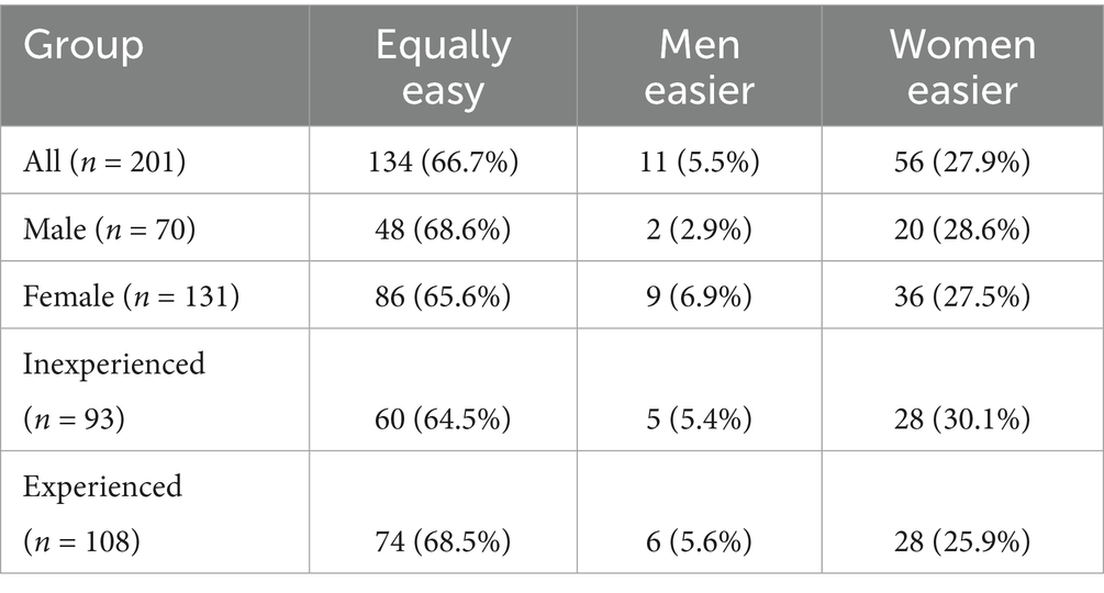 To better understand the reasoning behind these quantitative results, initial coding was performed on participants’ open-ended responses. The responses were initially categorized into three groups: Reasons for perceiving no difference (Table 3), reasons why women are perceived to be easier to understand (Table 4), and reasons why men are perceived to be easier to understand (Table 5).