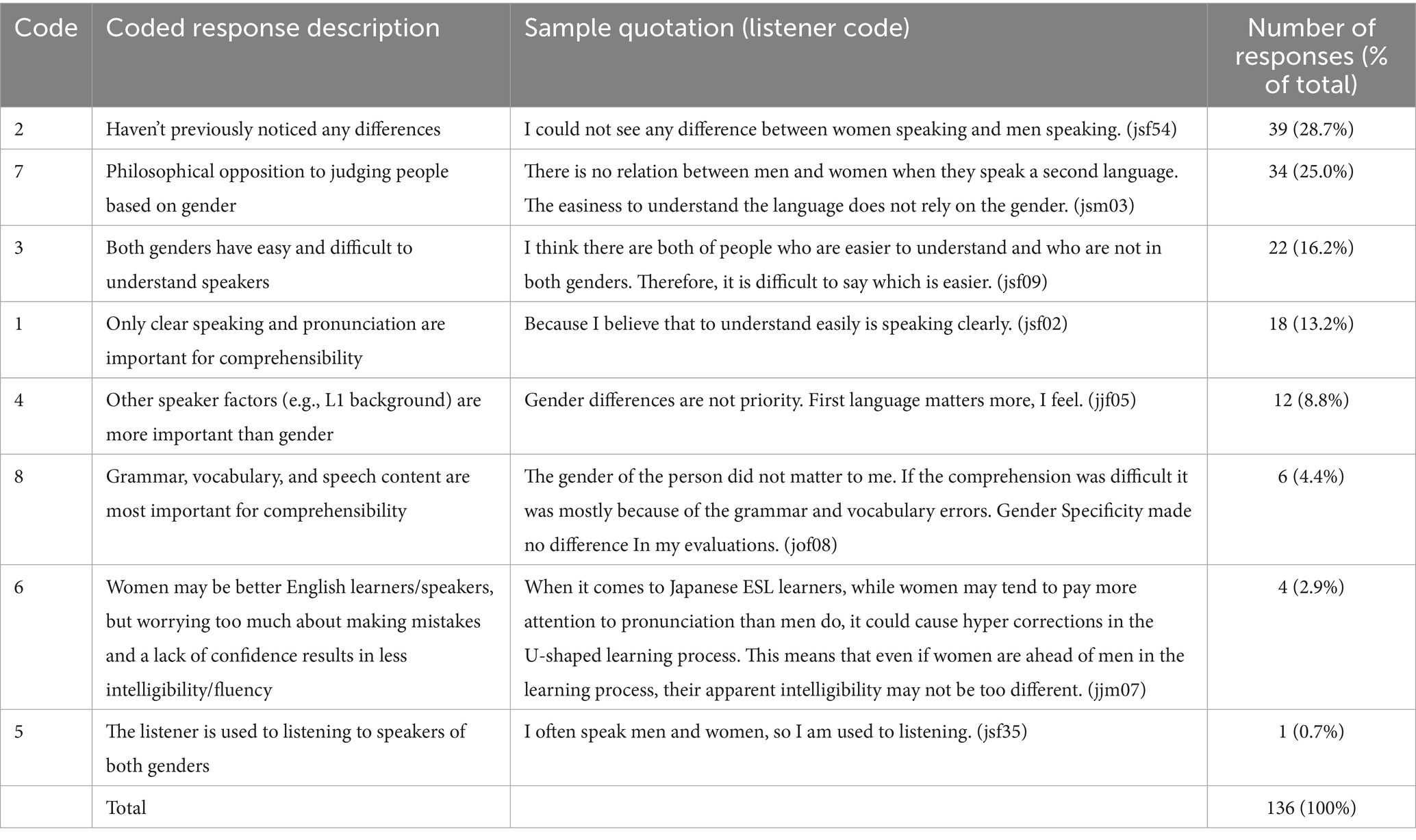 Table 6. Second-level coding of reasons for responses to the statement “men and women are equally easy to understand when speaking a second language”.