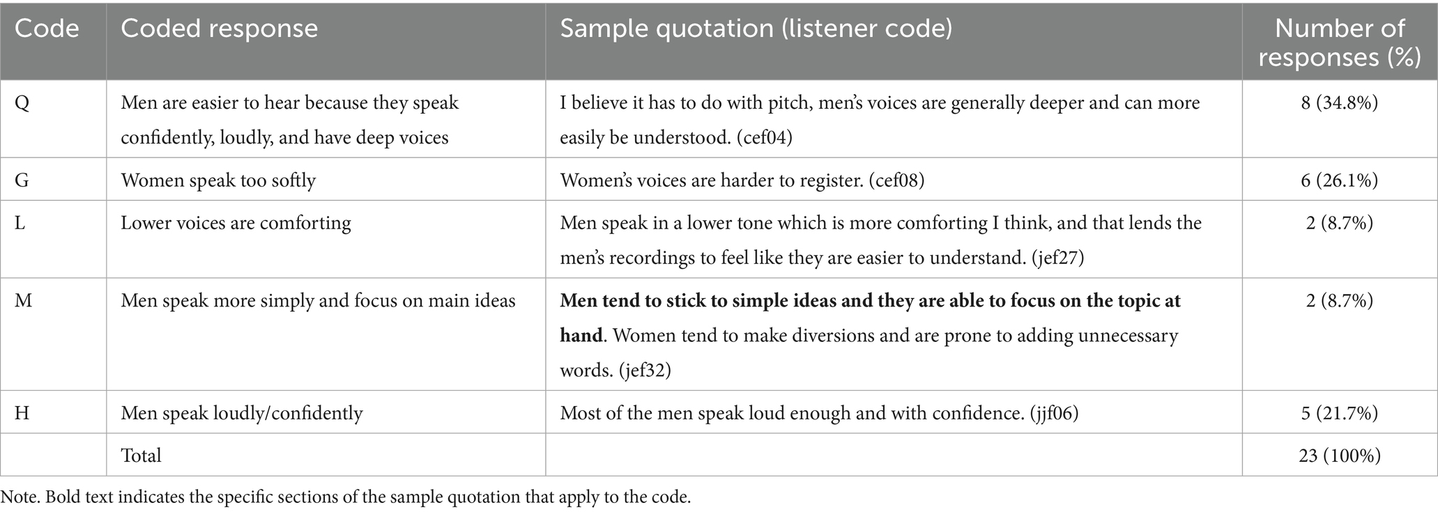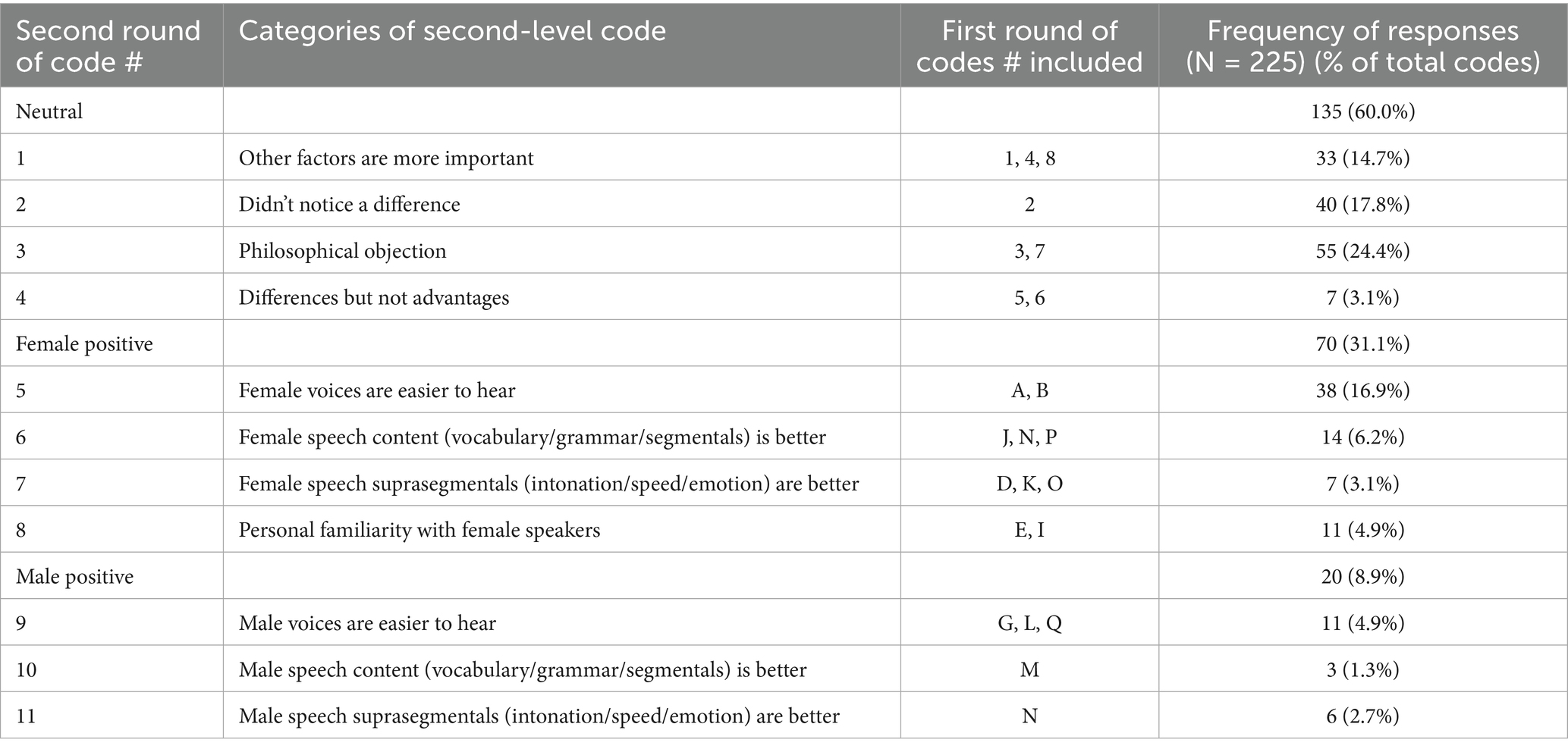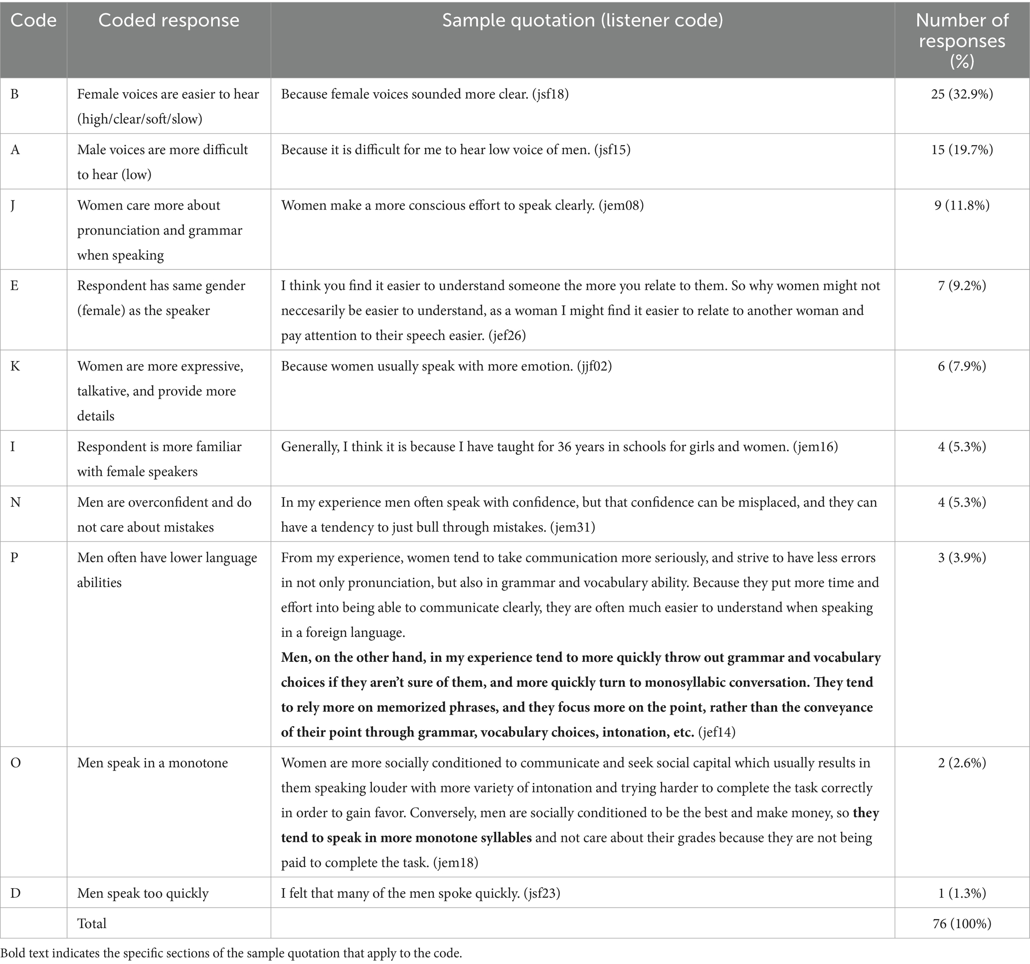 The initial coding result revealed that some response categories reflect similar perceptions from opposite directions. For example, as shown in Table 4, statements that female voices are easier to hear has the same implication as saying that male voices are difficult to hear. Likewise, the claim that women care more about speaking correctly mirrors comments that men do not care as much about making errors.