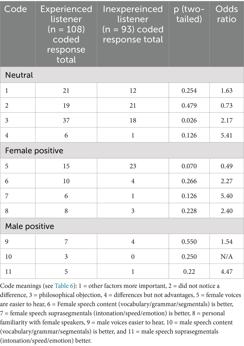 While the other neutral-coded categories did not show significant differences between male and female or experienced and inexperienced participants in the Fisher’s exact tests (Tables 7 and 8), the relative prevalence of the responses is informative. The second most common neutral-coded response (Table 6) was that the listener had simply never noticed a difference (code 2), followed by code 1, stating that factors other than speaker sex were more important for comprehensibility, and code 4, that there are differences in comprehensibility, but that these differences do not advantage one group or another.