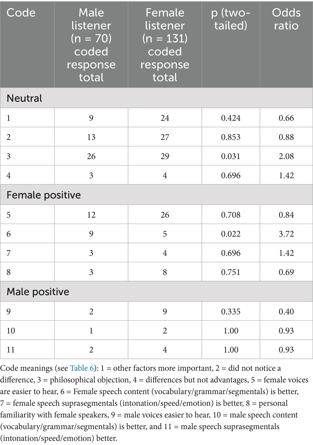 Listener gender also influenced perceptions. Male listeners were significantly more likely than female listeners to mention that female speakers had better speech content, while (although the difference is not statistically significant) female listeners were more likely to say that male voices are easier to hear. This pattern seems to reflect previous findings that men focus on linguistic content and grammatical accuracy, whereas women may be more attentive to aspects of vocal delivery (Duryagin and Dal Maso, 2022).