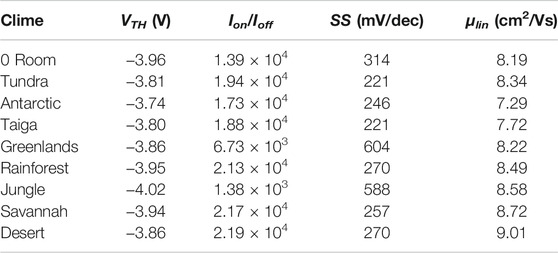 The TFT response to weather variations was evaluated by reproducing the most extreme climes on Earth planet, with their typical temperatures and relative humidity conditions as shown in Figure 2A. The transfer characteristics and the corresponding output were grouped for temperature below and above room T, in Figures 2B,C, respectively. For each weather condition, the transfer characteristic was acquired in the linear region (VDS = 0.1 V) and saturation region (VDS = 3 V). The gate current was not affected by climatic variations and remained constant in the microampere (μA) range. The electrical performance parameters are shown in Table 1 according to the order of the experiment. First, the TFT performances were evaluated from room T and RH (23.7°C, 55%) to negative temperatures. In particular, different climate conditions were simulated in the following order: Tundra (−2.0°C, 0%), Antarctic (−30.0°C, 0%), Taiga (−13.0°C, 0%), Greenlands (8.0°C, 60%), Rainforest (15.0°C, 80%). This protocol has allowed stable conditions (temperature and humidity) in the climate chamber during the TFT characterization. Within this region, a first positive shift of 0.22 V was observed from the initial condition to −30.0°C, 0% while the other parameters remained stable. Then, T was progressively increased up to 15.0°C as well as the RH from 0% to 80%. Here, an opposite shift of VTH was observed to a more negative value. This trend of VTH was in agreement with literature results showing how water vapour absorption induced charges accumulation on the active layer by depleting the channel Kim et al. (2017), Park et al. (2008). Coherently, the gradual reduction of VTH was observed up to Jungle conditions (26.0°C, 90%). Finally, a major impact of RH was observed when the device was brought to the high temperature zones with a reduction of RH. Specifically, the following geographical locations were mimicked: Savannah (29.0°C, 60%), and Desert (50.0°C, 22%). Despite T increasing up to 50.0°C between these two locations, the overall effect on VTH was a positive shift from −4.02 V to −3.86 V. An increase of the Ioff was denoted at high variations of the RH (ΔRH>30%), in agreement with Park et al. (2008). Accordingly, the Ion/Ioff ratio reduced of one order of magnitude down to 6.73 × 103 and the SS deteriorated. Differently from the other parameters, the linear mobility was not influenced by RH since it increased with T, showing a maximum variation of 10% at the highest T (50.0°C, Desert).