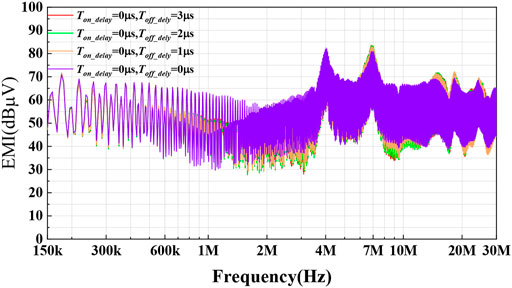 According to Figures 7, 8, the influence of Ton_delay on the EMI noise is limited, because the turn-on speed of the Si/SiC hybrid switch will change little with the increase in Ton_delay.