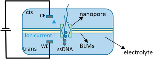 Compared with previously used sequencing methods using molecular probes and fluorescent labels, nanopore-based DNA sequencing is a label-free approach and meets the high speed and high throughput of DNA sequencing, and its low cost also has made this approach widely concerned and developed in recent years (Stagni et al., 2006; A. Shaghayegh, 2016). The main process of nanotechnology for DNA sequencing is shown in Figure 2. A certain voltage is applied to the nanopores on both sides of the bilayer lipid membranes (BLMs) through electrodes, first. When four bases pass through the nanopores, the equivalent resistances of the four bases are huge (usually at the level of GΩ) and have different blocking effects, which cause a current drop. Therefore, by detecting the change of solution current on both sides of the BLMs and recording the detected base sequence, the purpose of extracting genetic information from DNA can be achieved (Dong, Jiang, Jiang, Huang, & Qin, 2020).