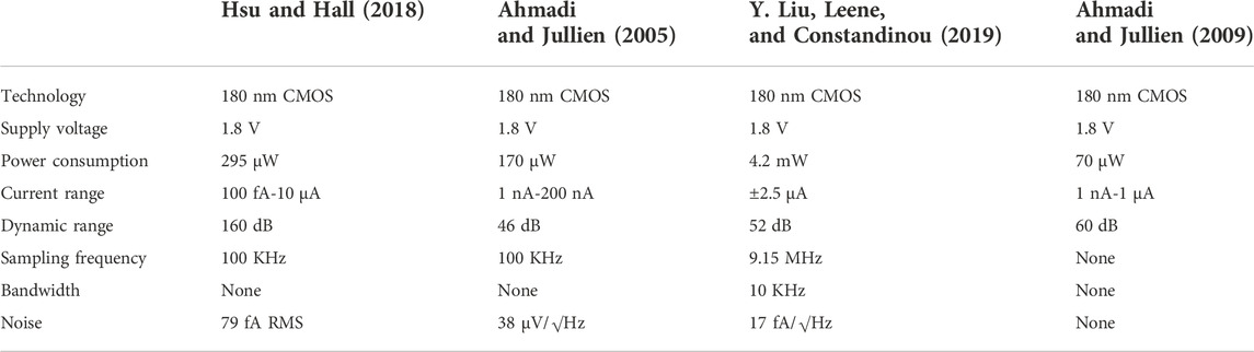 This section explains the choices of current-mode sensing front-end circuit, including the principle and the process of three structures to amplify the weak currents of DNA base. The advantages and disadvantages of the three structures are shown in Table 5 for the reference of designers. It is worth mentioning that designers can further improve or combine these three structures to converge their advantages (Crescentini, Bennati, & Tartagni, 2014).