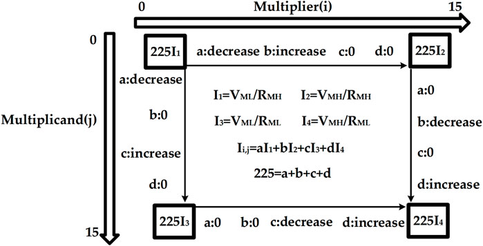 The final result Iout matrix shown in Figure 5 illustrates this issue in detail by enumerating all possible Iout values across all possible combinations of input operand values. This current map assumes that the operand encoded in voltage is called multiplier and the other operand encoded in memristor resistance is called multiplicand, without losing generality. Each operand is 4 bit wide and takes values from 0 to 15. When the multiplier increases from 0 to 15 we move from left to right along the i axis, 0 ≤ i ≤ 15, and when the multiplicand increases from 0 to 15 we move from top to bottom along the j axis, 0 ≤ j ≤ 15. At each position (i, j) in the matrix, Ii,j encodes the product of multiplying (multiplier = i) by (multiplicand = j). To simplify the presentation, we use four coefficients a, b, c and d to differentiate all the output currents and define Ii,j as Ii,j = aI1 + bI2 + cI3 + dI4. This means that moving down in the matrix, a decreases and c increases, with b and d held constant, and Move right in the matrix, b decreases and d increases, with a and c held constant. Because 15 × 15 = 225, a + b + c + d = 225. The four corner cases of the matrix are therefore Iout = 225I1, Iout = 225I2, Iout = 225I3, indicating final product values of 0 = 0 × 0 = 0 × 15 = 15 × 0, and Iout = 225I4 which indicates a final product value of 225 = 15 × 15.