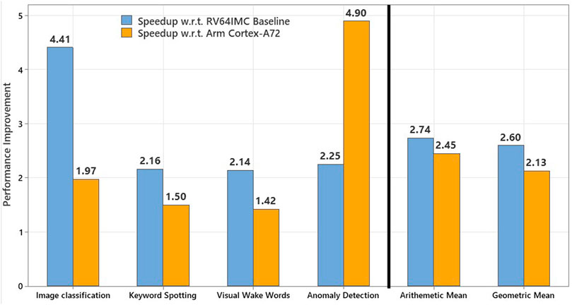 FIGURE 10. Performance speedup as a result of AI-PiM compared to RV64IMC RISC-V baseline and Arm Cortex-A72 processor on MLPerf Tiny benchmark.
