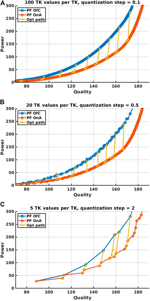 To this end, the yellow lines in each subplot show the optimization steps, starting from a few points on the OfC Pareto front. As can be seen, after one optimization iteration, the solution has reached (almost or exactly) the OnA Pareto front with a very similar quality, showing the high efficiency of the optimization algorithm in a theoretical case. Furthermore, bigger discretization steps (as shown in Figures 7B, C) are harder for the optimizer with solutions diverging more from the original quality but do not block its proper functioning.