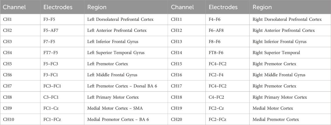 Consistent with these temporal trends, channel-level analyses (Tables 1, 2; Figure 3B) highlighted specific cortical regions showing marked differences between pre-fatigue and fatigue states. The medial premotor cortex (CH10) demonstrated increased outflow during fatigue, while the right anterior prefrontal cortex (CH12) showed the most pronounced alterations, with strong changes in both inflow and outflow. Additional effects were observed in the right inferior frontal gyrus (CH13) and right superior temporal gyrus (CH14), both of which displayed altered inflow and outflow. Further outflow differences emerged in the right premotor cortex (CH15), right middle frontal gyrus (CH16), and right primary motor cortex (CH18). Finally, the medial motor cortex (CH19) exhibited robust changes in both inflow and outflow. Taken together, these findings indicate that fatigue selectively modulates connectivity within prefrontal, premotor, and motor regions, with particularly strong effects in right-hemispheric circuits.