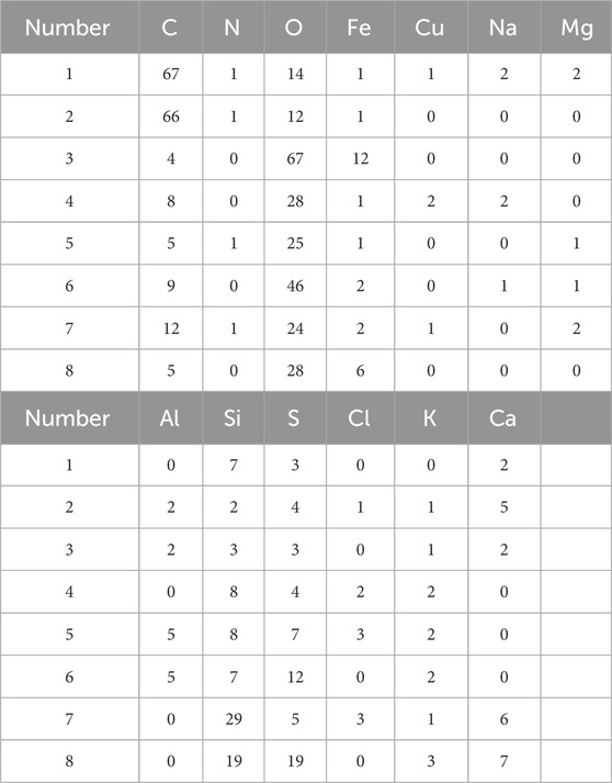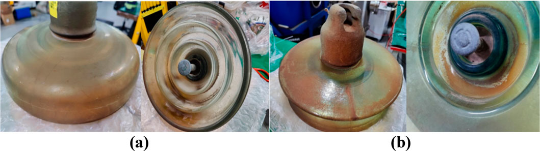 The composition of surface contamination is a critical factor influencing the pollution flashover voltage of insulators, while the operational environment significantly determines the nature of such contamination (Li et al., 2025; He et al., 2019). Existing studies indicate that the contaminants on the external insulation surfaces of power system components are complex in composition, with sodium chloride (NaCl) and calcium sulfate (CaSO4) being the predominant constituents. In coastal regions, NaCl tends to dominate, whereas in inland areas, CaSO4 is more prevalent (Ramos et al., 1993). Beyond natural environments, special operational settings can also alter the chemical makeup of insulator contamination (Zhang et al., 2022; Salem et al., 2022b; Feng et al., 2019). For instance (Sopelsa Neto et al., 2022), pointed out that pollution increases the surface conductivity of insulators, thereby raising the likelihood of partial discharges and dry band arcing, which can have a significant impact on the power system. This issue is particularly critical for insulators located near industrial, mining, and coastal areas, where pollution is more likely to accumulate on the insulator surface. Dolník et al. (2023) investigated the dielectric loss factor and leakage current of glass insulators under various pollution and humidity conditions. They found that the leakage current is highly dependent on the variation of the applied voltage and is very sensitive to changes in both relative humidity and the level of pollution. In artificial AC pollution tests (Ramos et al., 1993), observed that the flashover voltage of contaminated insulators decreased with increasing equivalent salt deposit density (ESDD). Baker et al. (1988) further found that the impact of insoluble contaminants on DC flashover voltage was greater than that under AC conditions, due to differing electrostatic adsorption effects on insoluble particles under DC fields. In certain regions of China, favorable geological conditions and abundant mineral resources support a well-developed metallurgical industry, resulting in atmospheric dust with a high metal content. When suspension insulators accumulate contamination with a high proportion of metallic components, these metal particles can significantly affect the insulation performance (Li et al., 2020; Liu et al., 2016; Zhang et al., 2014) reported that the presence of aluminum and iron elements among the insoluble metallic contaminants notably reduces the pollution flashover voltage of insulators.