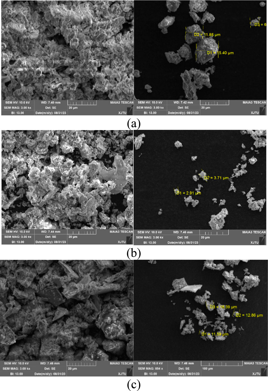 Scanning electron microscope was used to photograph the contaminant samples, to characterize the microscopic morphology of three contaminant samples, to observe the contaminant arrangement of different contaminant samples, and to measure the parameters such as the shape of the contaminant particles and the size of the contaminant particles of different contaminant samples. The results of Sample #1∼ Sample #3 scanning electron microscopy are shown in Figure 2.