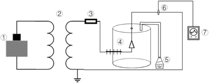 Figure 3. Schematic diagram of leakage current measurement test platform ① voltage regulator ②test transformer ③ protection resistor ④ acrylic can ⑤ humidifier ⑥ current transformer ⑦ oscilloscope.