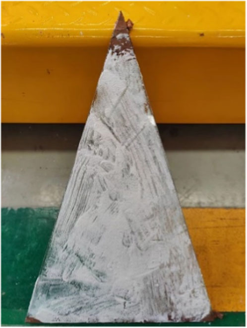 During the experiment, according to the experimental method in (Wang et al., 2019), an isosceles triangular glass plate was used in place of an actual insulator. Since glass insulators possess an axisymmetric structure, each individual shed unit closely approximates a fan-shaped cross-section distributed along the central axis. The apex of the triangular glass plate exhibits analogous edge effect characteristics in its electric field distribution to those observed in a single shed unit of the insulator. The glass plate has a height of 45 cm, a base length of 30 cm, and a thickness of 8 mm. Conductive tape was applied to both the apex and the base of the triangle to facilitate voltage application at both ends. The prepared triangular glass plate specimen, after the application of artificial contamination, is shown in Figure 4.