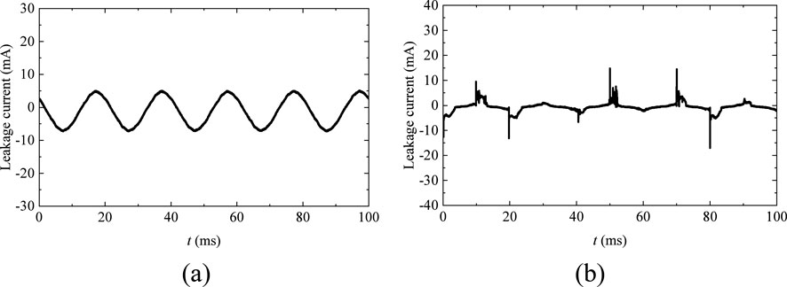 Figure 5. Waveforms of leakage current with different metal ratios. (a) Contamination without metallic components. (b) Contamination with metallic components.