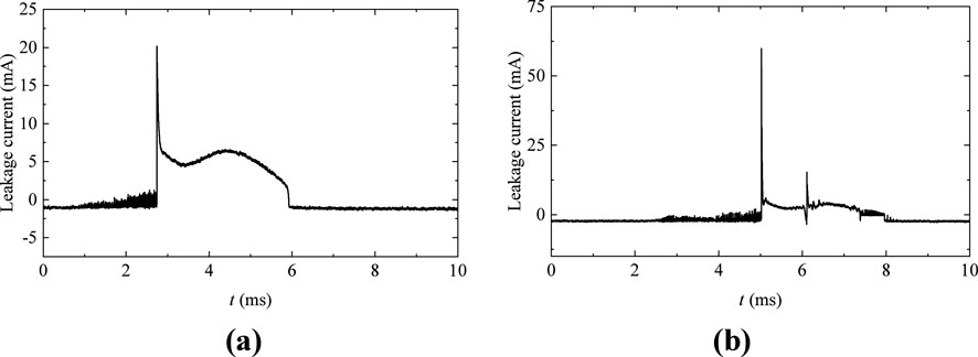 Figure 6. Single-pulse waveforms of leakage current with different metal ratios. (a) Contamination without metallic components. (b) Contamination with metallic components.