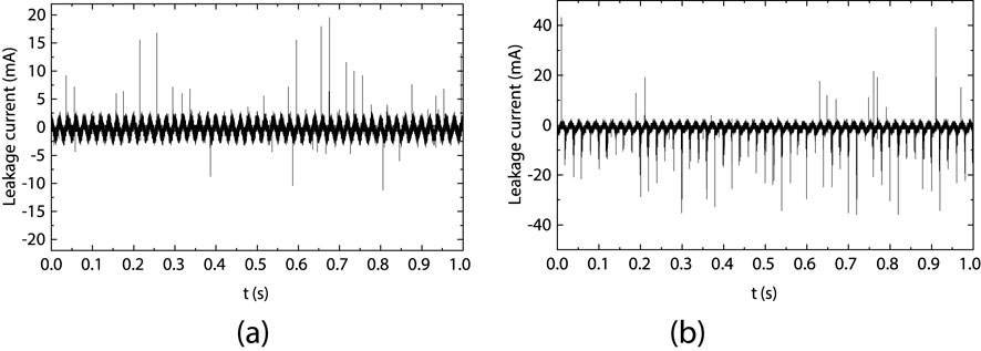 The typical surface leakage current waveform of the glass plate specimen is shown in Figure 7. As illustrated in the figure, when the contamination contains a high proportion of metallic components, the leakage current waveform under AC voltage consists of a superposition of an AC component and high-frequency pulse components.