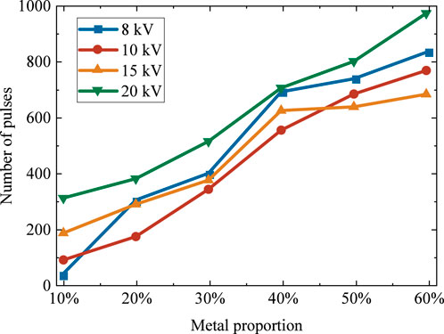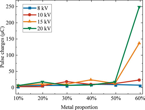 Comparing the relationship between metallic proportion and discharge quantity under different voltage levels reveals that this relationship varies with voltage magnitude. At lower applied voltages, the discharge quantity increases gradually with metallic content and does not exhibit any sharp rise. In contrast, at higher voltages, the discharge quantity increases sharply as the metallic proportion increases.