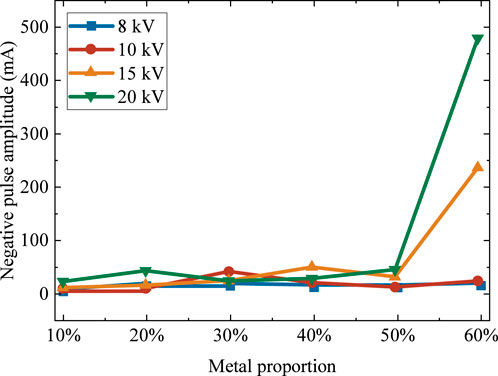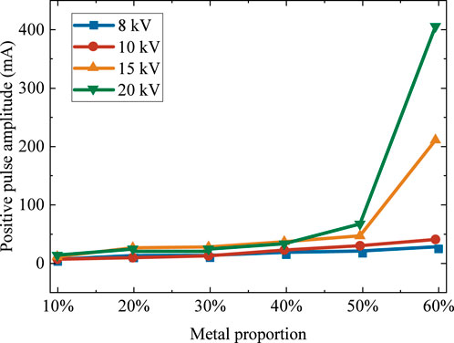 Comparing measurements under different voltages reveals that when the metallic proportion is low, the positive pulse amplitude varies little across voltage levels. However, when the metallic content is high, the positive pulse amplitude exhibits significant variation with applied voltage. These results indicate that the influence of voltage on the positive pulse amplitude becomes more pronounced as the metallic proportion in the contamination increases.