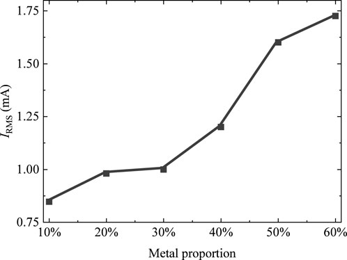 In this experiment, the equivalent salt deposit density (ESDD) was set at 0.05 mg/cm2, and the non-soluble deposit density (NSDD) was maintained at 5 mg/cm2. The relationship between the proportion of metallic content in the contamination and the RMS value of the leakage current is shown in Figure 12.