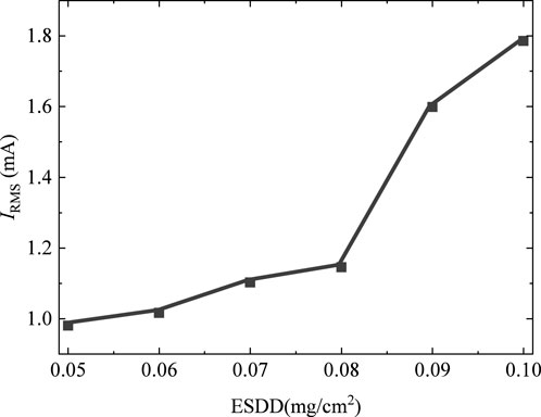 As shown in Figure 12, under fixed soluble and non-soluble contamination densities, the RMS value of the leakage current on the surface of the glass plate specimen increases nonlinearly with the proportion of metallic components in the contamination.