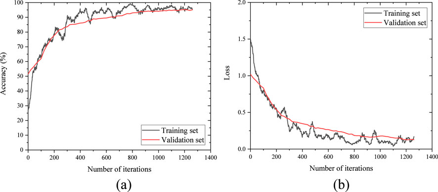The learning rate of the ResNet18-SA model was set to 1 × 10−4, with a batch size of 8. A total of 480 leakage current waveform images were used as the dataset, which was split into training and validation sets in a 7:3 ratio. The training and validation accuracy and loss curves during the training process are shown in Figure 15. By the 1000th iteration, the model began to converge, achieving an accuracy of 96% on the validation set and reducing the loss to 0.1. Both the accuracy and loss curves gradually stabilized, indicating good training performance.