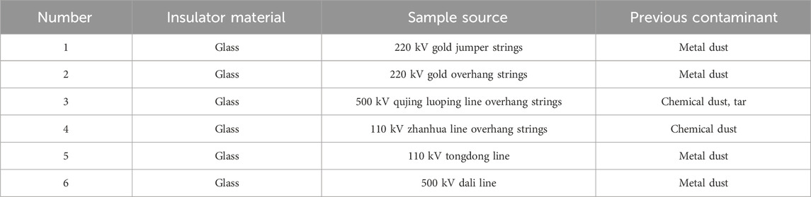 To clarify the contamination composition on the surface of glass insulators in miner-al and metallurgical environments, field sampling was conducted in regions with concentrated mineral resources and metallurgical industries. Two glass insulator samples were collected: one from a 220 kV jumper string and another from a 220 kV suspension string, both operating in long-term metallurgical environments. Detailed information on the sampling conditions is provided in Table 1.